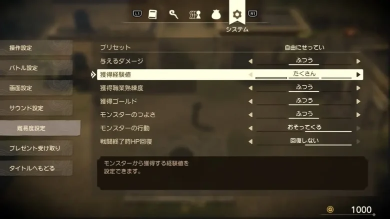- 難易度設定の細分化: 「楽ちんプレイ」「バッチリ冒険」「いばらの道だぜ」のプリセットに加え、「自由にせってい」を選ぶことで、与えるダメージ、獲得経験値、獲得職業熟練度、戦闘終了時のHP回復など7種類の項目を個別に調整できるようになりました。これはゲーム中いつでも変更可能です。