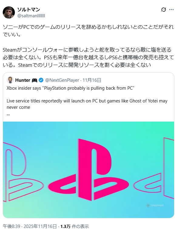 引用:著名リーカーJez Corden「SONYはSteamでのソロゲー発売をやめる可能性がある」 https://krsw.5ch.net/test/read.cgi/ghard/1763216454/