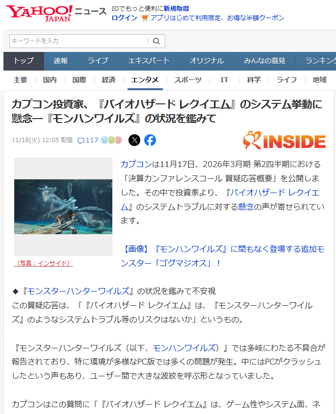 カプコンの決算説明会で、『バイオハザード レクイエム』(バイオ9)に「モンハンワイルズのような不具合リスクはないのか」という懸念が投資家から寄せられました。