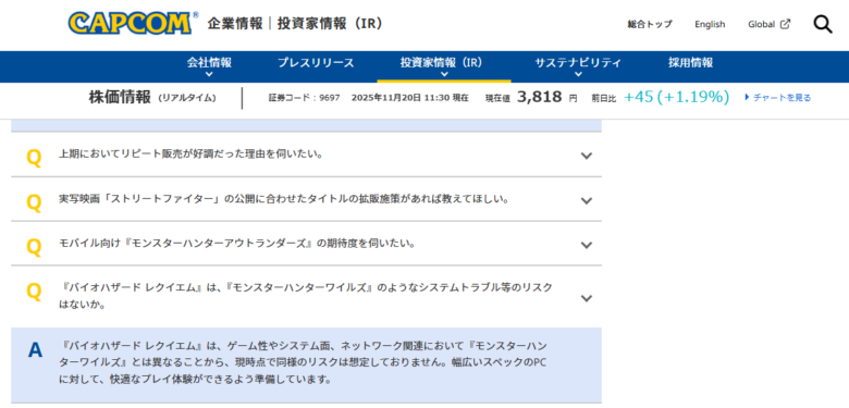 実際の質疑応答では、カプコンが「レクイエムはワイルズとはゲーム性やネットワーク構造が異なるため、同様のリスクは想定していない」と回答し、幅広いPCスペックに向けた最適化を進めていると説明しました。