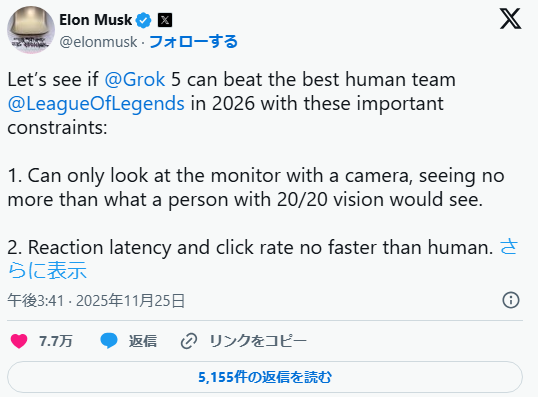 時期と内容: 2026年に、AI「Grok 5」が『LoL』の人類最強チームを倒せるか試したいと投稿。
